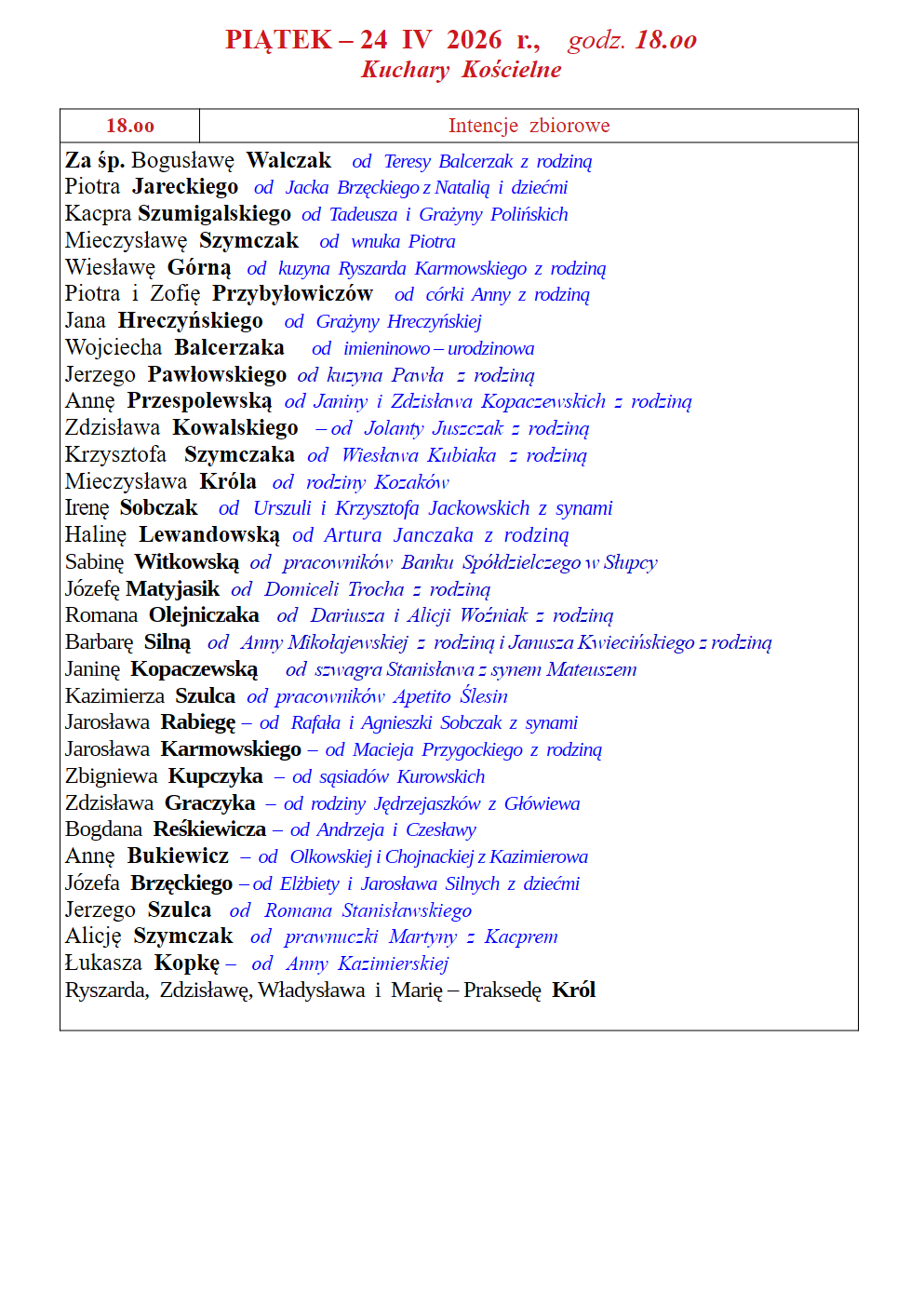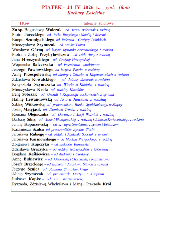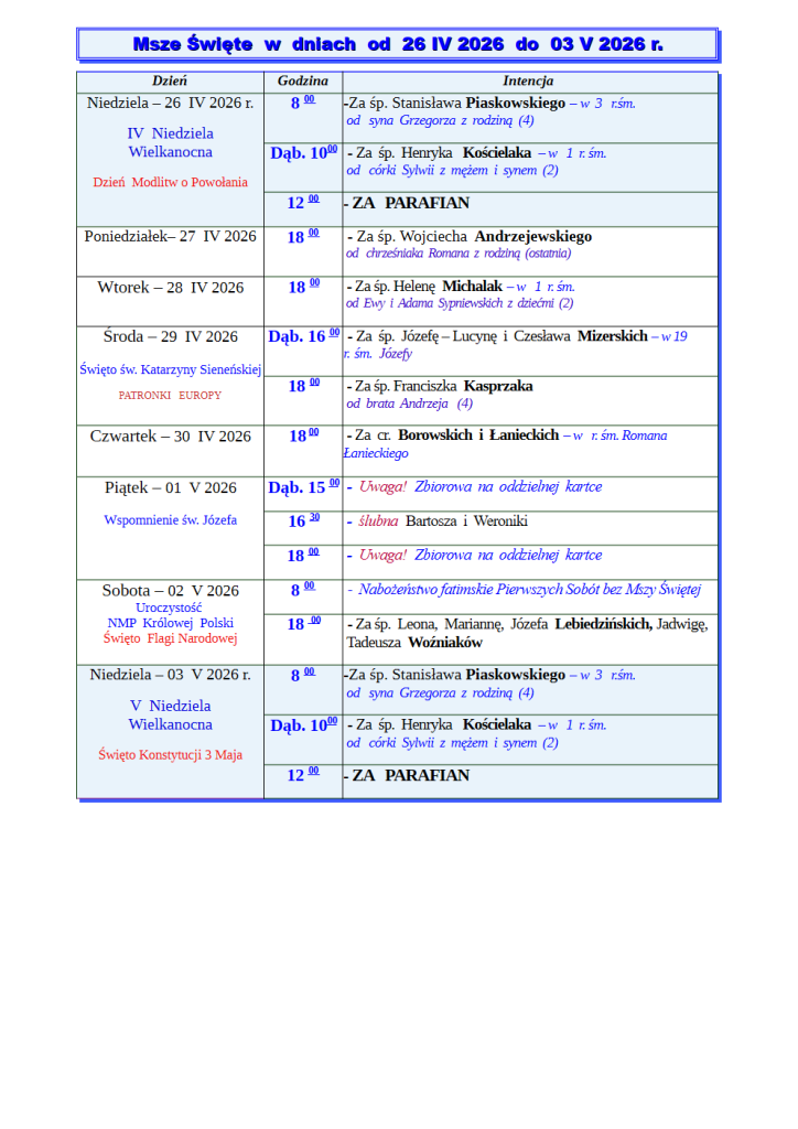 Intencje Mszalne – od 26 kwietnia do 03 maja 2026 roku